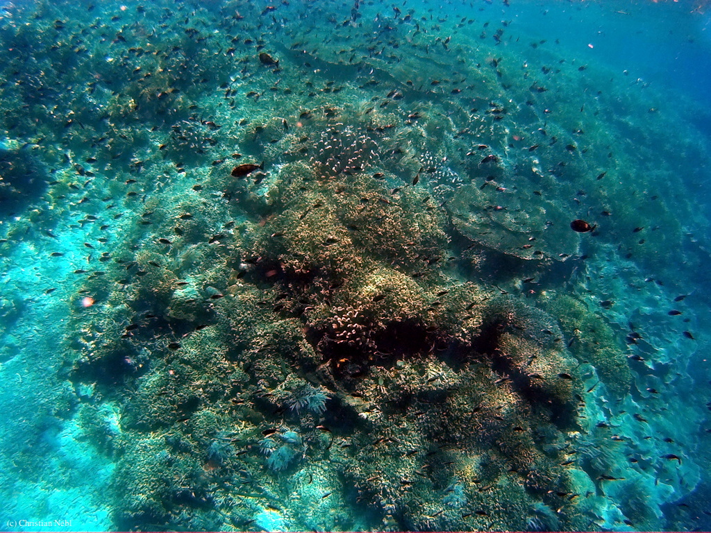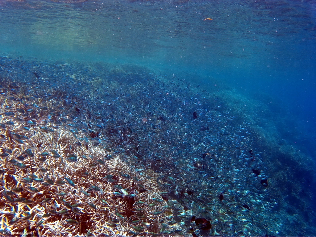 Ich halte lieber mal etwas Abstand zu Christian und schwimme dorthin, wo “die Wall” ist. Rund um die Insel ist eine Kante, an der es runter geht und überall sind Korallen und zig Fische. Teilweise leg ich die Arme direkt an den Körper, weil so viele Fische um mich herum schwimmen. Weiter unten an der Wall sitzen die Schildkröten, die man immer dann erst erspäht, wenn sie nach oben schwimmen, um Luft zu holen. Hier gibt es so viele Schildkröten, dass man bei jedem Schnorchelgang mindestens eine zu sehen bekommt. Manchmal sieht man sie auch vom Boot aus.